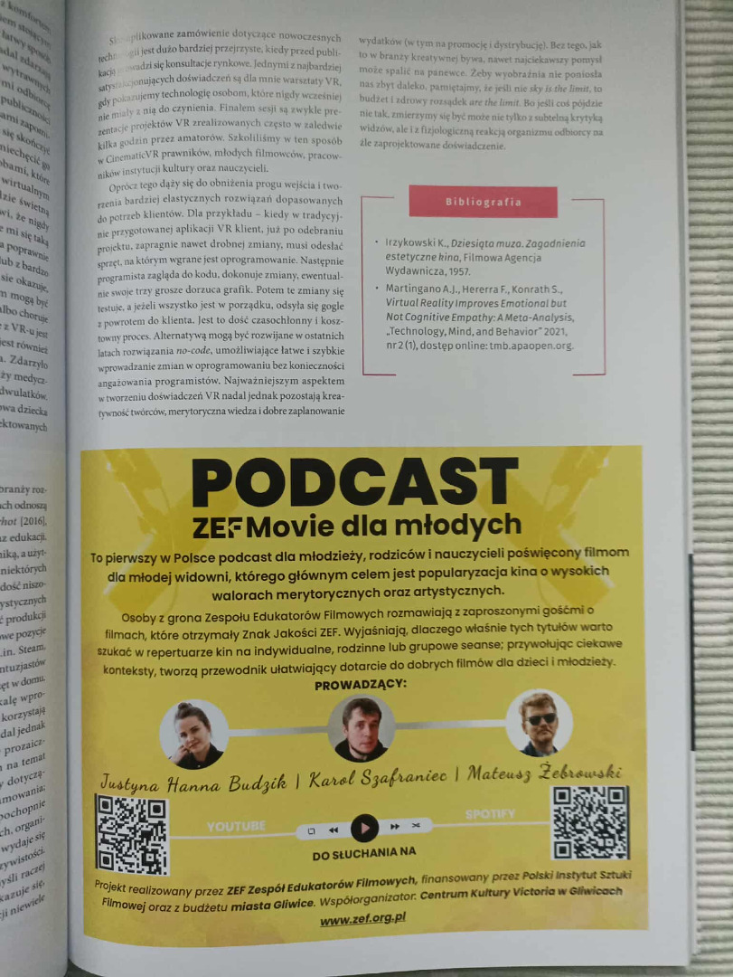 Nowy odcinek podcastu ZEF movie dla młodych już nadchodzi i tym razem będzie on poświęcony polskiemu kinu młodego widza.Naszą rozmówczynią będzie Katarzyna Gradowska – kulturoznawczyni, filmoznawczyni i menedżerka kultury z ponad dziesięcioletnim doświadczeniem w zarządzaniu dużymi projektami kulturalnymi. Obecnie pełni funkcję Kierownika Działu Realizacji Wydarzeń w Stowarzyszenie Filmowców Polskich, gdzie odpowiada za planowanie i wdrażanie projektów o zasięgu ogólnopolskim i międzynarodowym. Jej kompetencje obejmują kierowanie zespołami, współpracę z partnerami instytucjonalnymi i biznesowymi oraz projektowanie i realizację wydarzeń – od konferencji, przez festiwale, po programy wspierające rozwój kultury filmowej. Doświadczenie zawodowe zdobywała zarówno w środowisku korporacyjnym, akademickim, jak i kreatywnym, co pozwala jej łączyć menedżerską precyzję z otwartością na innowacje. W centrum jej działań znajduje się edukacja kulturalna i budowanie świadomej, aktywnej publiczności. Wierzy, że kultura ma moc nie tylko inspirowania, ale również realnego kształtowania społeczeństwa. Jedna z koordynatorek projektu Polskie Kino Młodego Widz.